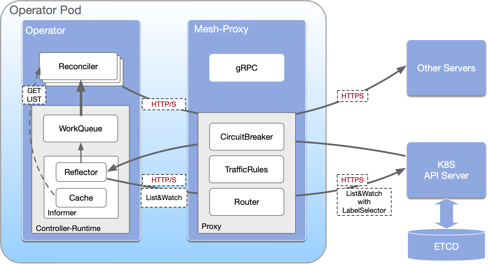 This proxy container will intercept and handle the connection by between API/Oth Server and controllers/webhooks in the Pod.