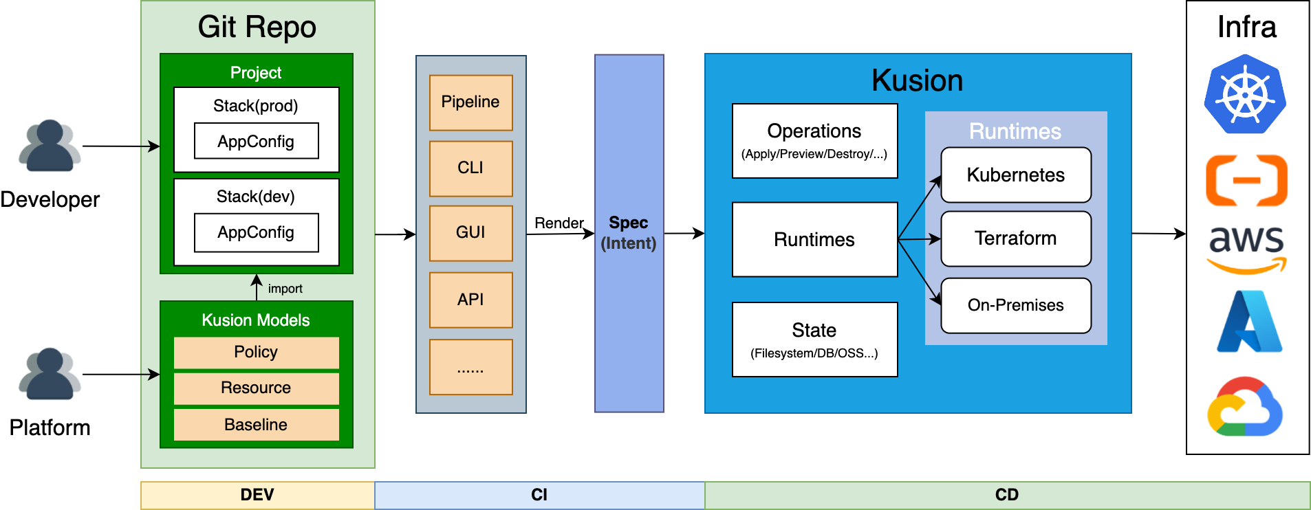 On the other hand, Kusion defines a new way of how different engineering teams collaboration. With the separation of concerns, different roles could focus on their work based on their knowledge and responsibility. Through such a division of labor, the platform team can better manage the differences and complexities of the platform, and app developers could participate in ops work with less cognitive load.