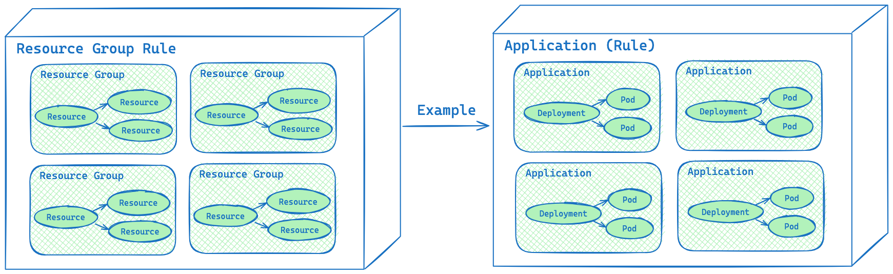 A resource group rule is a set of conditions that groups specific resources into appropriate resource groups. These rules aim to organize resources into logical units based on properties such as annotations, labels, namespace, and so on. For example, to define an Application resource group rule, you can specify the app.kubernetes.io/name annotation as a grouping condition.