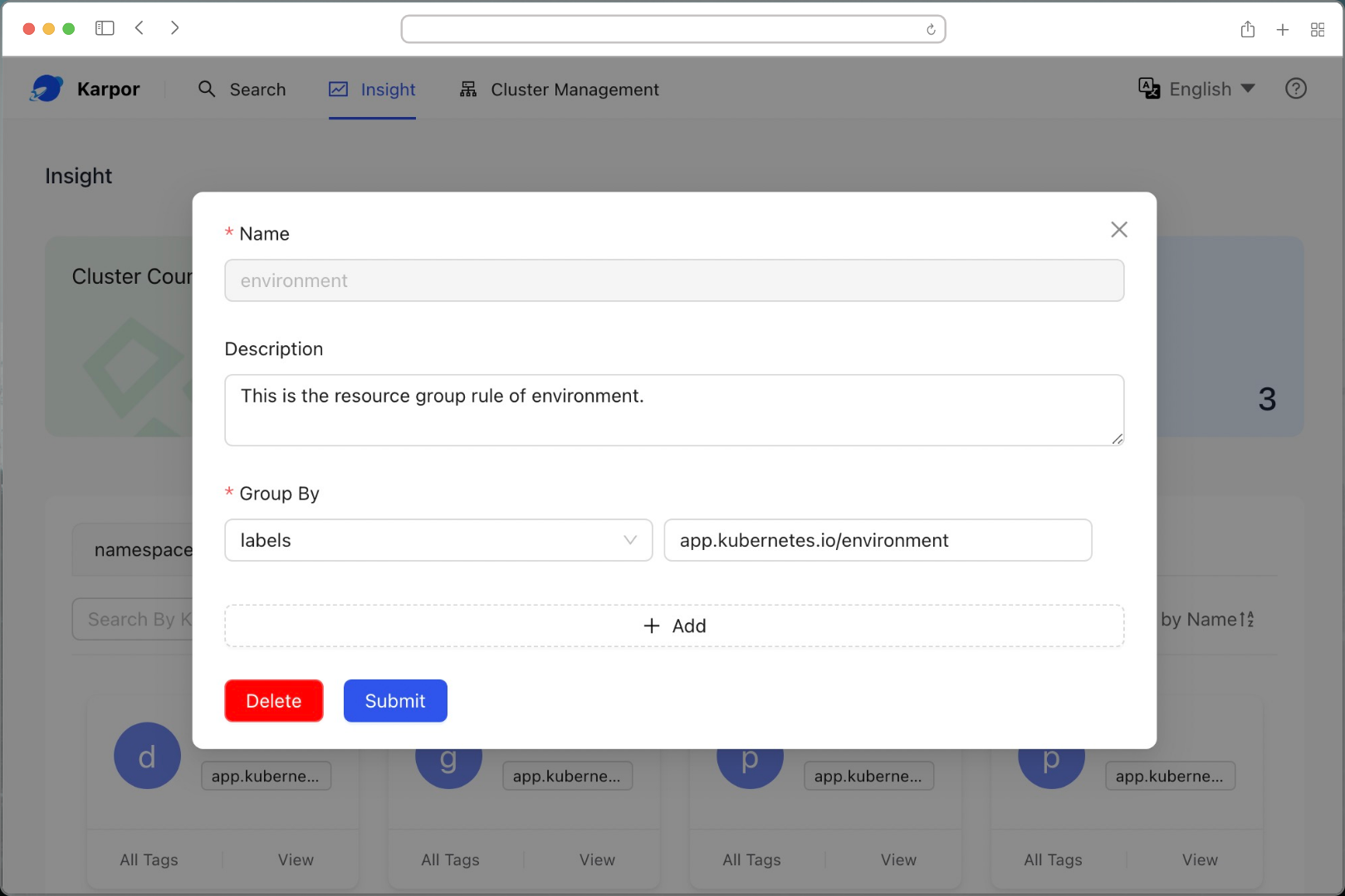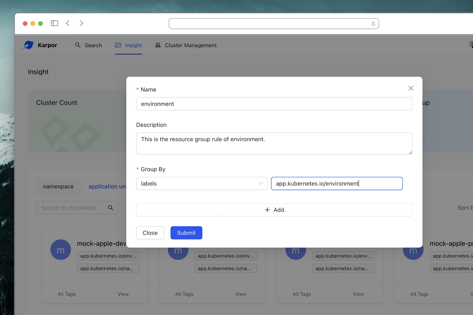 This section will focus on how to create custom resource group within Karpor. Through custom resource group, you can flexibly manage and organize resources in Karpor according to your own needs and logical concepts. We will guide you step by step to create and define custom resource group and show you how to use these groups for resource insight and management.
