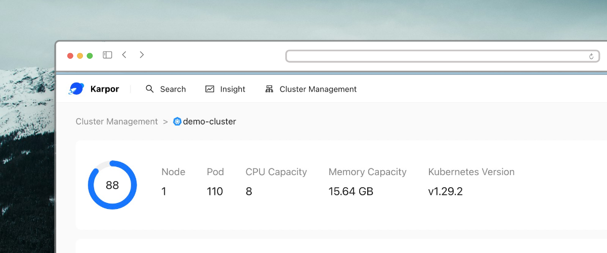 1. Cluster Insight Page, the summary card shows the Node, Pod numbers, CPU, memory capacity, and Kubernetes version of the cluster.