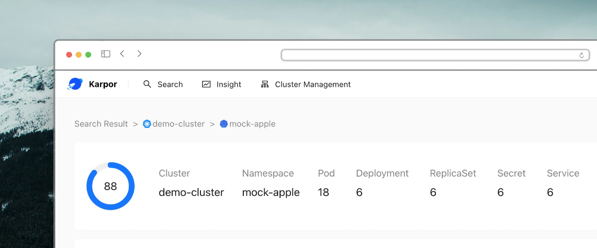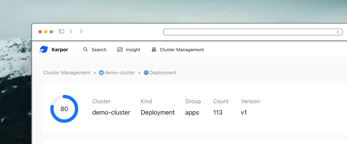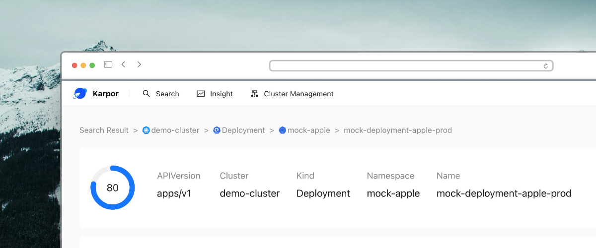 2. Resource Insight Page, the summary card shows the current resource's name, GVK information, affiliated cluster, and namespace.
